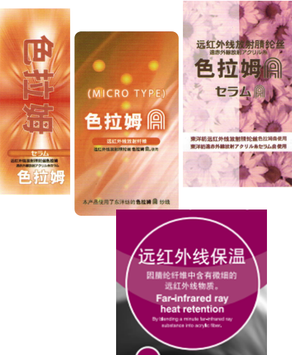 東洋紡公司作為保暖內(nèi)衣材料銷售吸濕發(fā)熱性材料”依克絲”。但還有一種使用和“依克絲”完全不同的手法來開發(fā)的保暖內(nèi)衣材料。這就是“色拉姆A”,“色拉姆A”是把具有遠紅外線放射性的陶瓷超微粒滲入到腈綸短纖維中的。由于這個陶瓷超微粒反射人體發(fā)出的遠紅外線,從而“色拉姆A”發(fā)揮對秋冬內(nèi)衣不可缺少的優(yōu)異的保暖效果。而且“色拉姆A”的保暖效果洗后幾乎沒有減少,其顯色性、染色牢度也與普通腈綸短纖維相同。